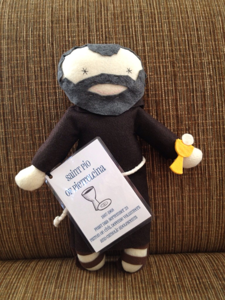 I began my catechist vocation in 2007 teaching the second grade sacramental year when our oldest was preparing for her sacraments. I loved teaching the second grade sacramental year so much that I permanently volunteered to be the second grade teacher every year. During those years I learned that teaching younger children requires plenty of visual aids. I had many ideas for the curriculum but when it came to penance I was out of ideas. Teaching the sacrament of penance can be tricky. Confession has a way of being seen as….well……not pleasant. This is a result of parents and other adults expressing their negative thoughts and opinions about this sacrament to children. Because of these negative perceptions I was constantly encountering children who were afraid of confession. I needed something pleasant to emphasize the importance of making a good confession. Something to bring them to Jesus in a positive way. By chance or I like to think through the Holy Spirit I found this Padre Pio doll. In 2013 he became the saint I chose to use as a way to impress upon the students the significance of the sacrament of penance. This doll became an important part of my first penance lesson. I used this doll in all grades when reviewing penance with the students.
