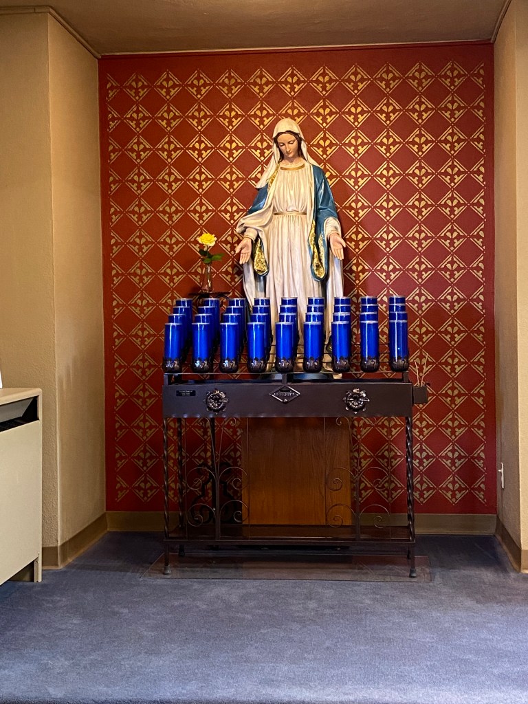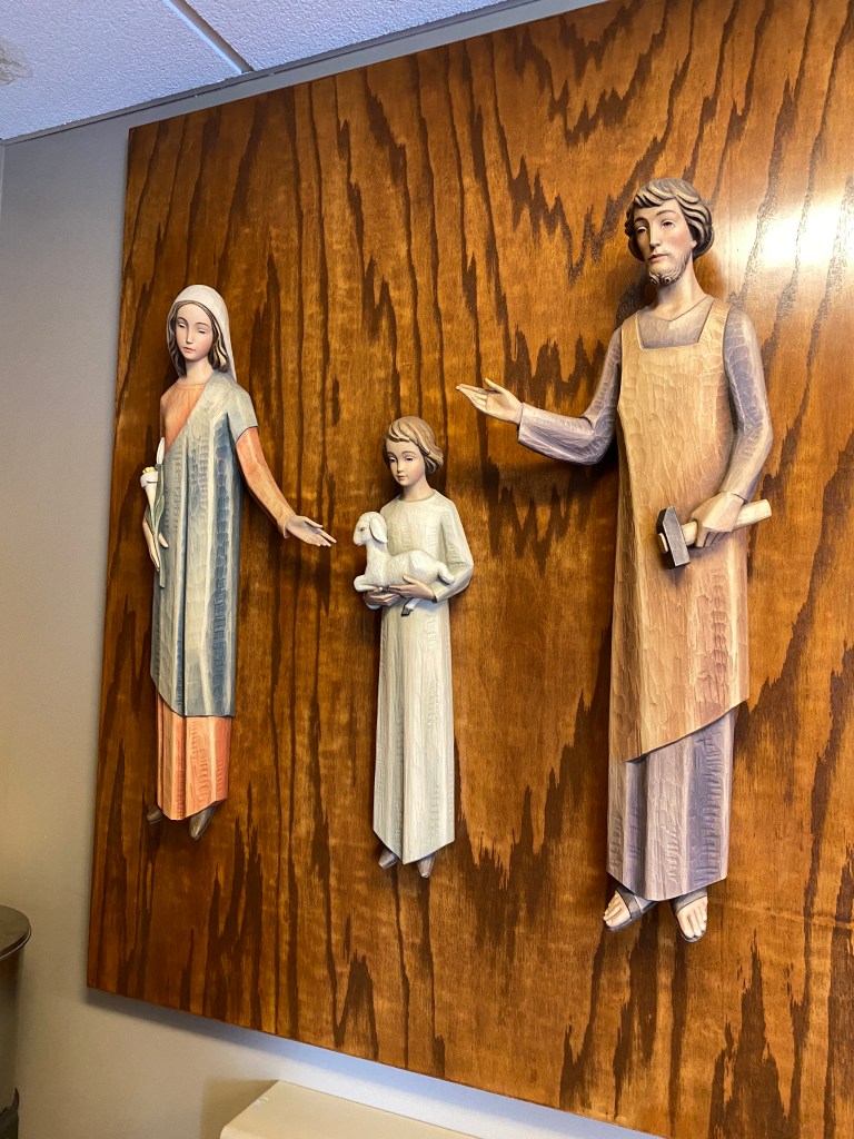 In the vestibule a statue of St. Isidore to your left greets you as you arrive in the church. St. Isidore is the patron saint of farmers and rural laborers. It was no surprise to us being in the heart of America’s farmland to see this saint having a prominent location in this parish. He was known for his love of the poor, and there are accounts of Isidore’s supplying them miraculously with food. He had a great concern for the proper treatment of animals as he would have been in close contact with those that are so commonly found on farms. A little more about St. Isidore can help us understand the strong connection this saint has with farming communities. St. Isidore’s devotion to the faith caused presumption of his character. His habit of rising early for prayer at churches in Madrid often led to his tardiness to farm work. This tardiness was mistaken for languorousness. Being a farmer, therefore, requires patience, perseverance and focus. A lesson we can learn from St. Isidore is that if you have your spiritual self in order, your earthly commitments will fall into order also. Matthew 6:33 He married Maria de la Cabeza and together they had one child who did not survive past childhood. In spite of their personal hardships they generously helped needy neighbors. He died May 15, 1130, and was declared a saint in 1622.