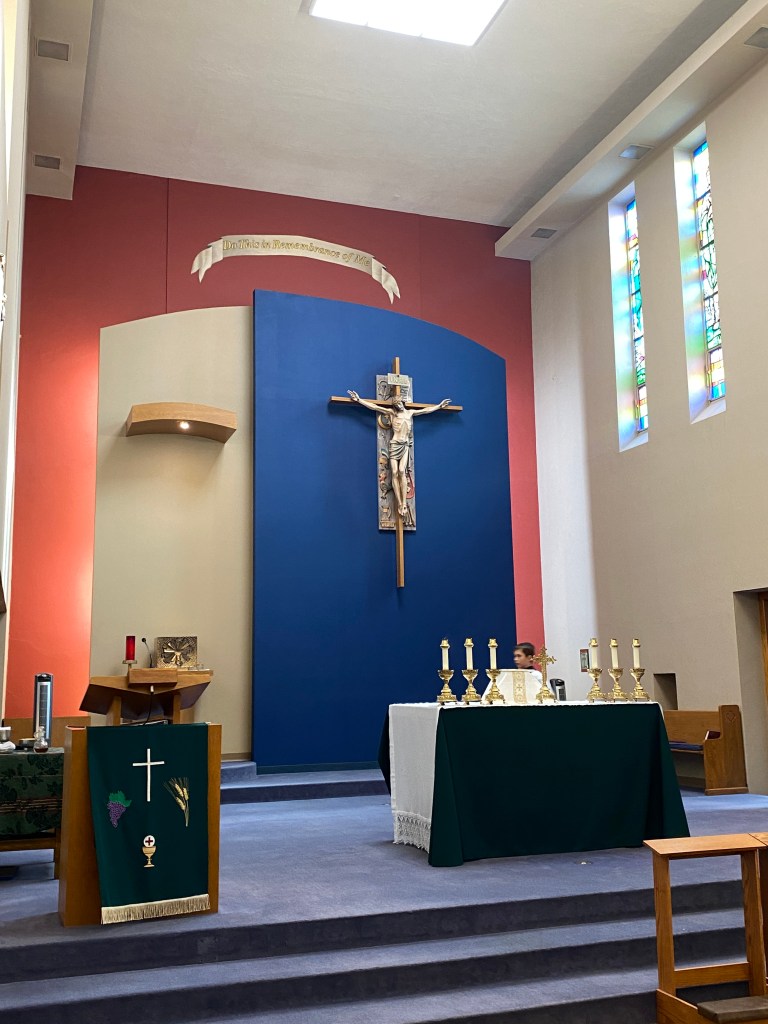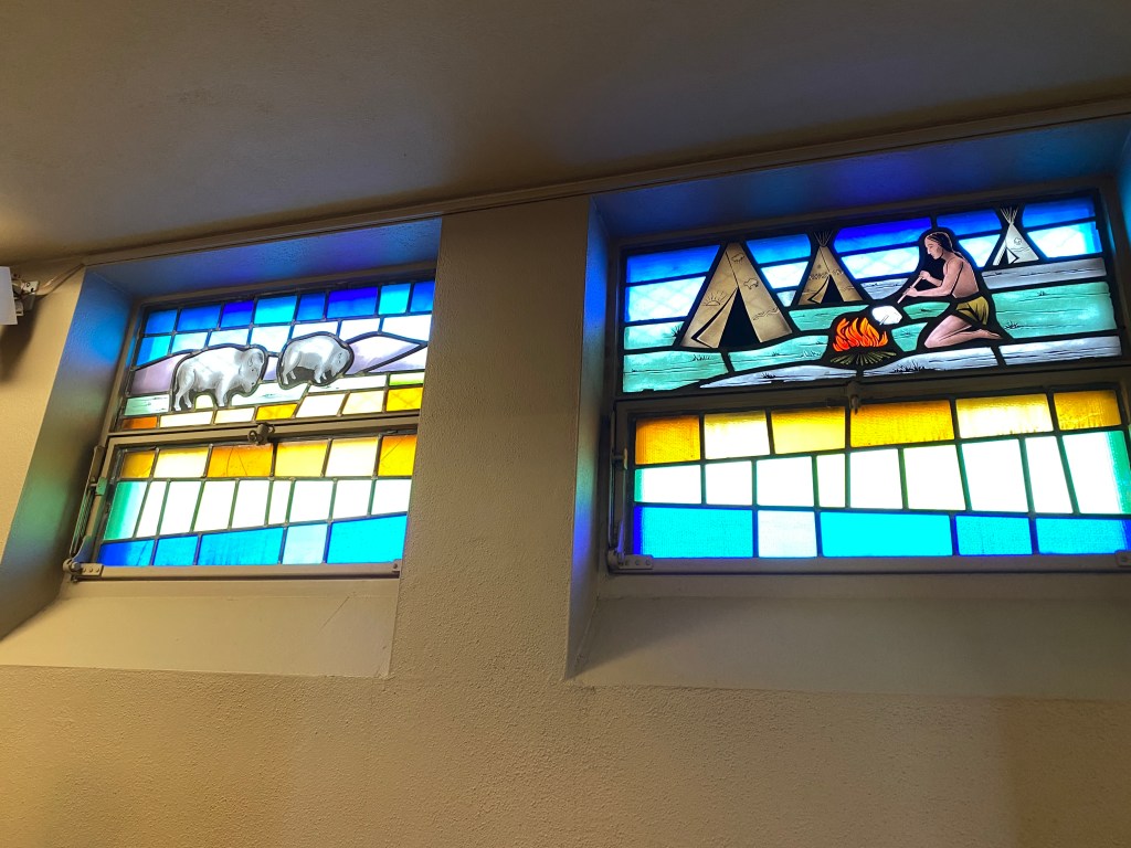 We began our day with Sunday Mass at Sacred Heart Catholic Church, Colby Kansas. A modest sized church with a quiet robust community. The early Mass was full of families. Being visitors it can be hard to find your bearings, especially if you have a rambunctious toddler who is not being a good guest. I spent a good deal of Mass in the vestibule where I was able to take in some of the church’s personality if you will. Prayers for rain were said at the close of mass as well as prayers for vocations. There were lovely stained glass windows portraying life on the prairie. This was not a parish of lingerers, you can tell that this community is diligent with their time management.These days of active farming means every moment of daylight is used efficiently. We observed families making quick plans to gather for brunch before taking on the day’s list of farming chores. I was glad to see such a lively church with strong extended families. While other Catholic communities may be suffering big losses it is reassuring to see a parish brimming with life.