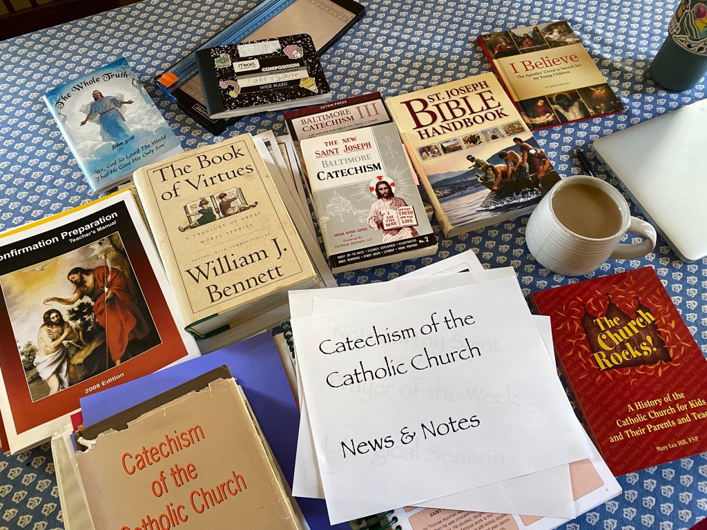 For the past few weeks this has been my dining room table. Piles of books and papers. Several mugs of coffee constant distractions and general disorganization. I do not have a designated work space in our home I have to carve out a spot on the dining room table. I try to set up 2 mornings a week where I can devote a few hours to creating religious education lessons. What I have learned from the past year is that we need to have focus for the children. This has been our weakness. I am a proponent of organic learning where you are led as you go. I see how that can be disconnected especially when you should be emphasizing a certain topic. This year we have a first year Confirmation prep student so we will need to take a more organized approach to our typical non sequitur schoolhouse.*