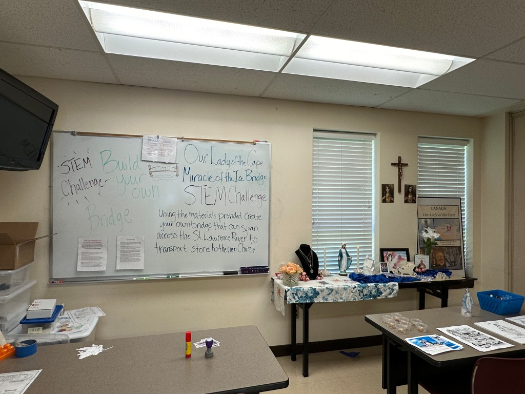 In the classrooms there were various themed rooms with unique activities and or experiences. There was a preschool room where the younger children could spend time working on multiple activities tailored to ages 3-6. One room was devoted to learning about Mary’s wardrobe and was more lecture based with opportunities for the children to handle materials. Another room was dedicated to the Rosary. There you could make a some sacrifice beads or have your broken/damaged rosaries repaired. The remaining five classrooms were devoted to a lesser known Marian image/apparition as the focus for the activity. This is where I was assigned to volunteer. My apparition was: Our Lady of the Cape in Trois-Rivières, Quebec. The other rooms were: Our Lady of Aparecida in Brazil, Our Lady of Siluva in Lithuania, Our Lady of Guidance in Philippines, Our Lady of Kibeho in Rwanda.
