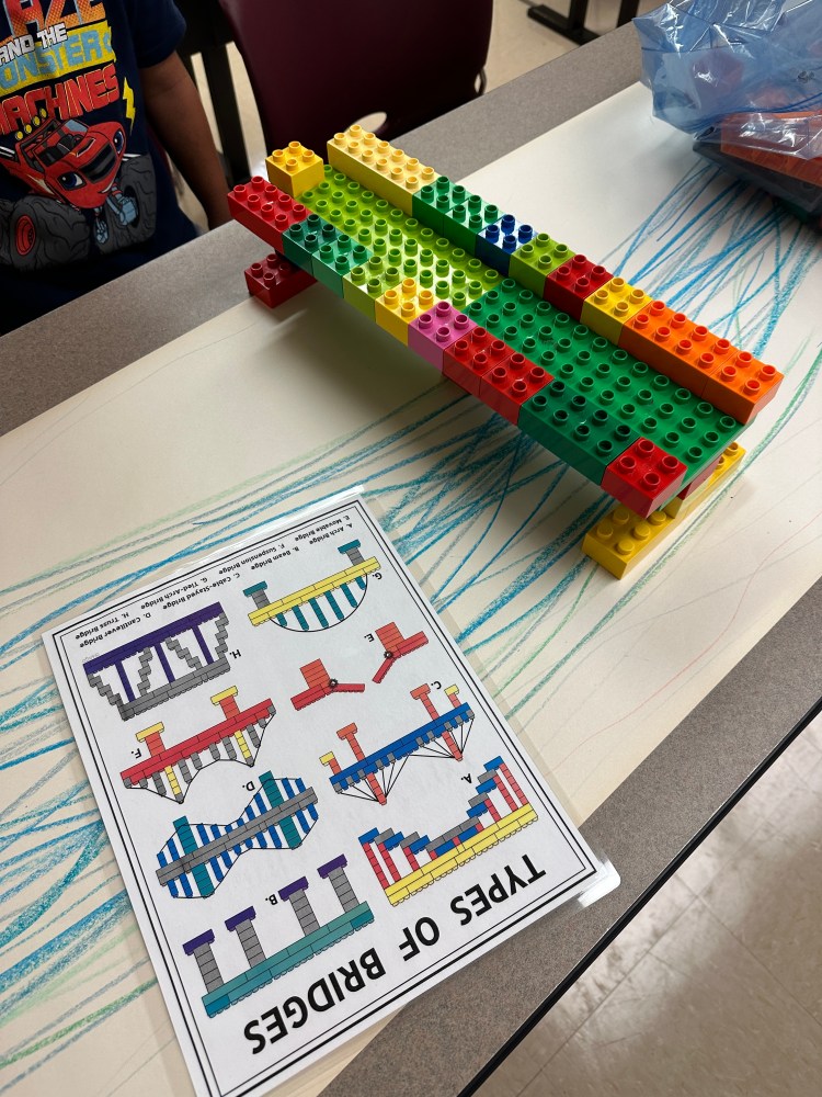 For the STEM challenge I created several stations where I placed different materials for use to create bridges across the river. I taped craft paper to the table and drew river shapes on to the paper with crayons. I provided some guideline packets for each table with examples of how to build bridges with the materials. The stations were: Legos, straws and playdough, cups and popsicle sticks, pencils and rubber bands, Kapla blocks and wood rounds, and loose parts. Loose parts were just an assortment of office supplies and random items I collected that would be interesting to use. I had tape, paperclips, binder clips, brads, rubber bands, paper, straws, pencils….and some things I can’t recall. I designed these stations based off of the things I had in my own home that would be familiar to children. (I have linked below some of the sources I used to inspire these ideas. I found printout packets on the TeachersPayTeachers site. I suggest looking there if you want a set lesson plan to use at home.)