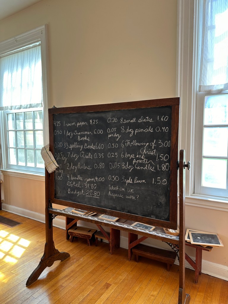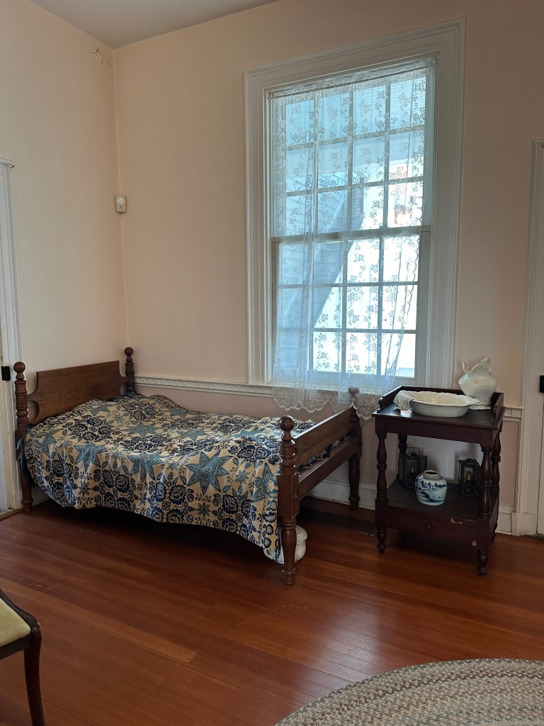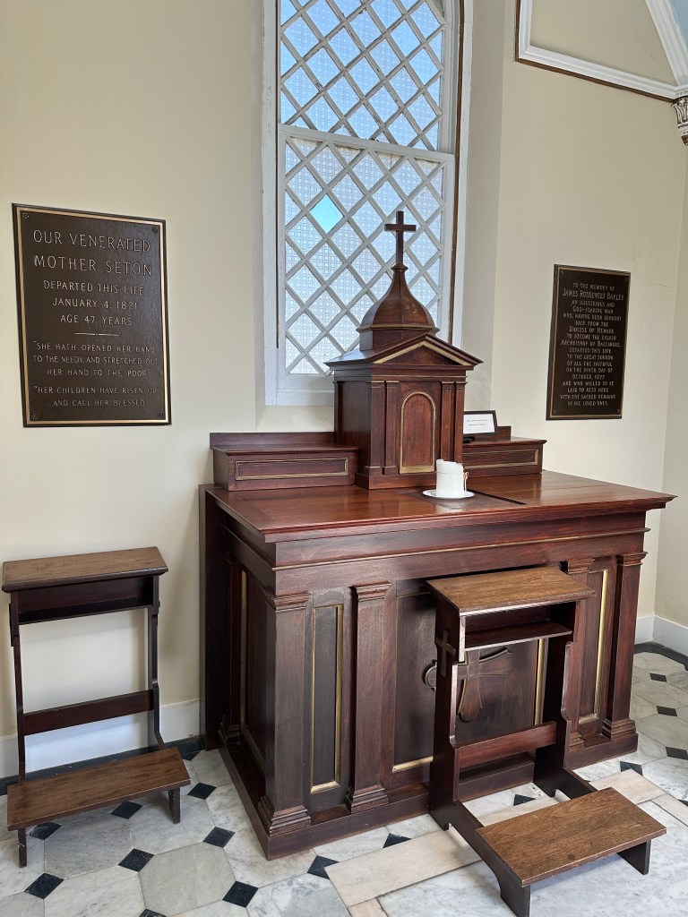 The second stop on the tour was the Historic St. Joseph’s House. This is the larger white house where the academy was most active in the later years of Mother Seton’s life. The house is furnished with period items so you can see how this building was used in the mid-1800s as the heart of the St. Joseph’s school. Being able to see the classrooms and chapel was so fascinating. On the weekends the Shrine hosts Living History Experiences and Hands on History for families. Those days are good days to visit and have an interactive experience being able to listen to historical interpreters and sample classroom lessons in an immersive program. See their Living History page for dates and times.