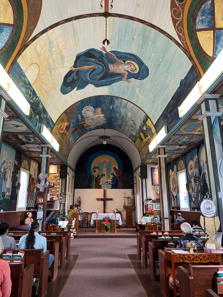 We were unable to attend the Mass at St. Theresa Catholic Church and Holy Rosary Mission Church in Mountain View, HI. One of the three Painted Churches of the Big Island this church is one that is not so often visited. I suspect based on its small size and it being a Mission Church tourists are not stopping in. Built in 1936 by a Belgian priest, Father Evarist Matthais Gielen he continued the vision for recreating painted ceilings to replicate the magnificent artwork found in Cathedrals of Europe. The paintings began to expand from ceilings to walls and eventually to every surface that was able to be painted. These churches have artwork in nearly every corner. Details can be found wherever the eyes may wander. It truly is breathtaking.
